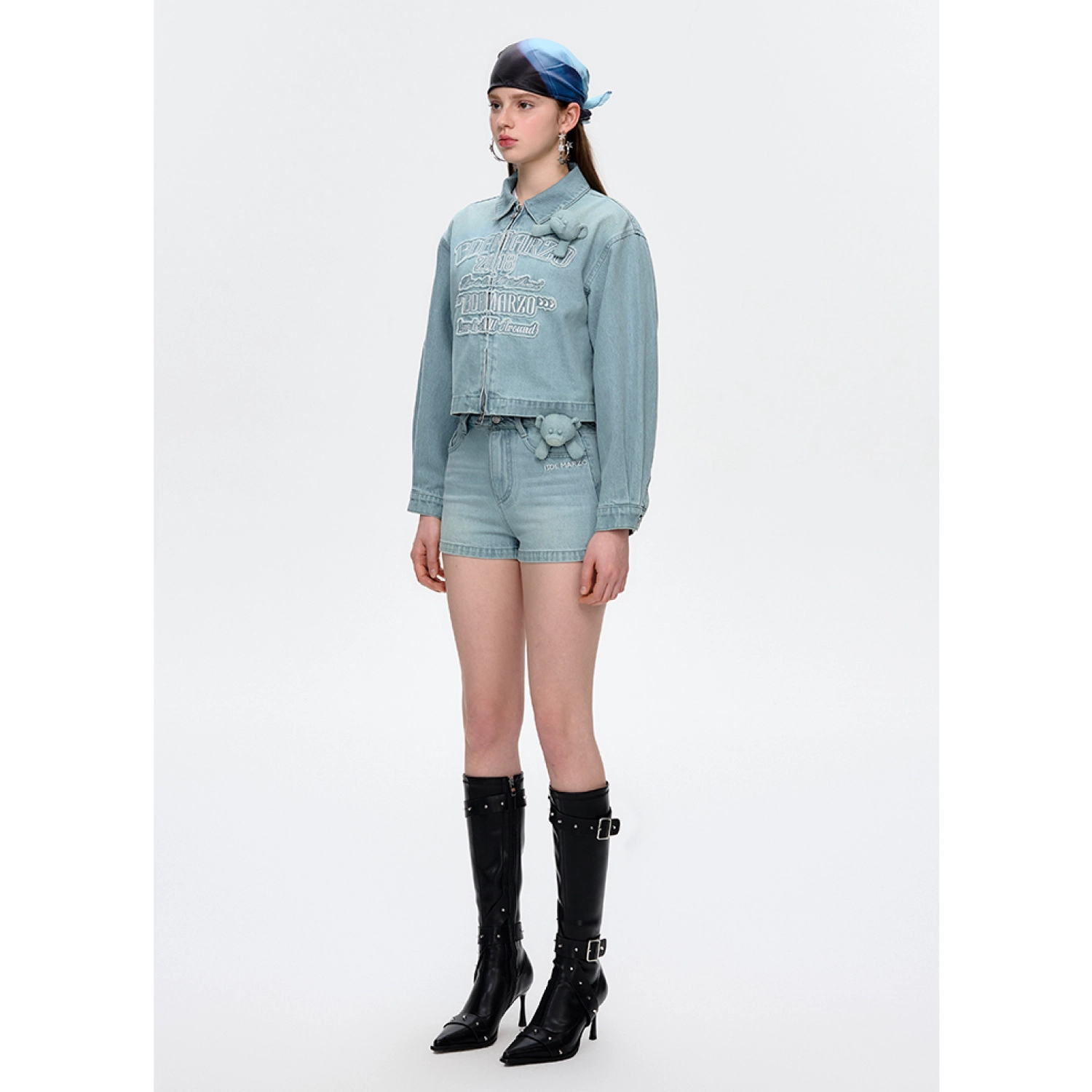 13DE MARZO Denim Frayed Embroidered Shorts Blue
