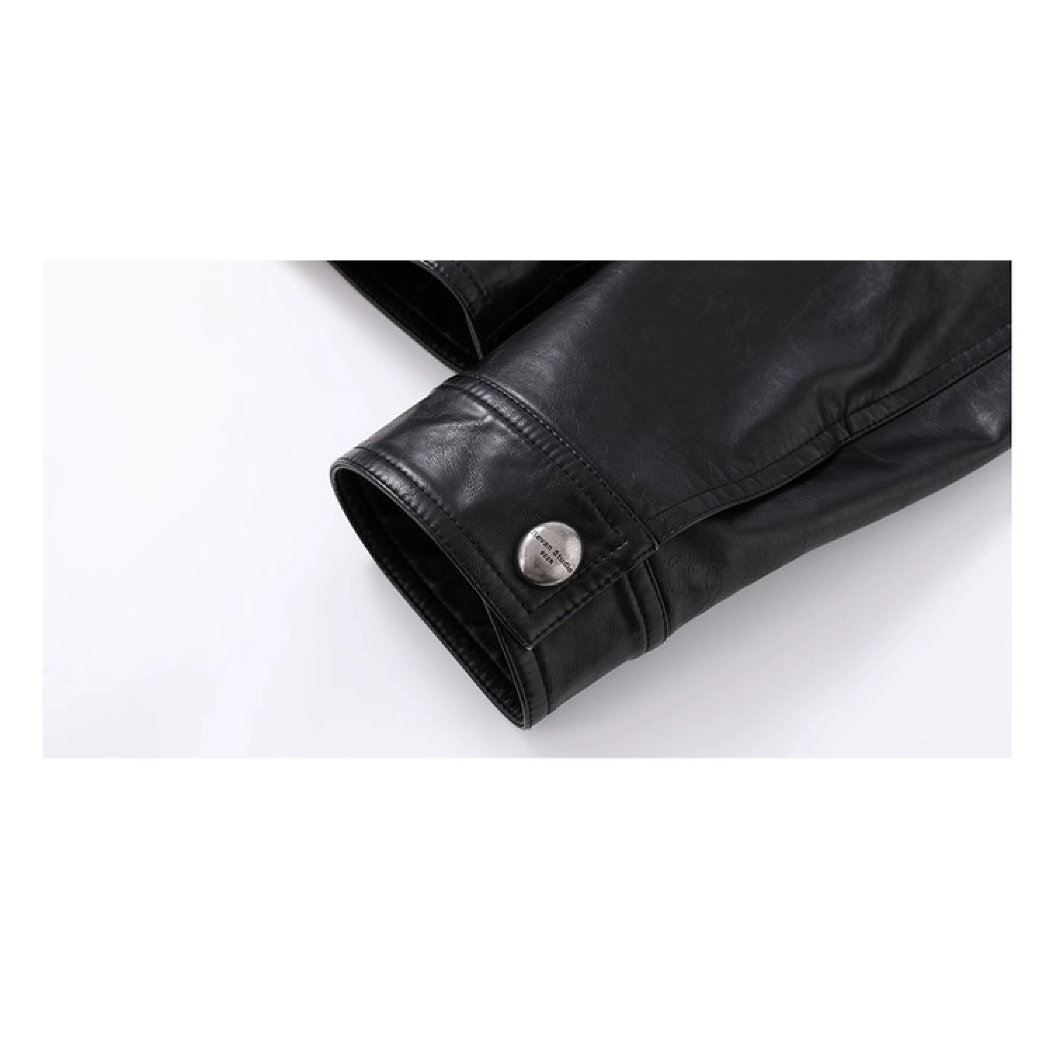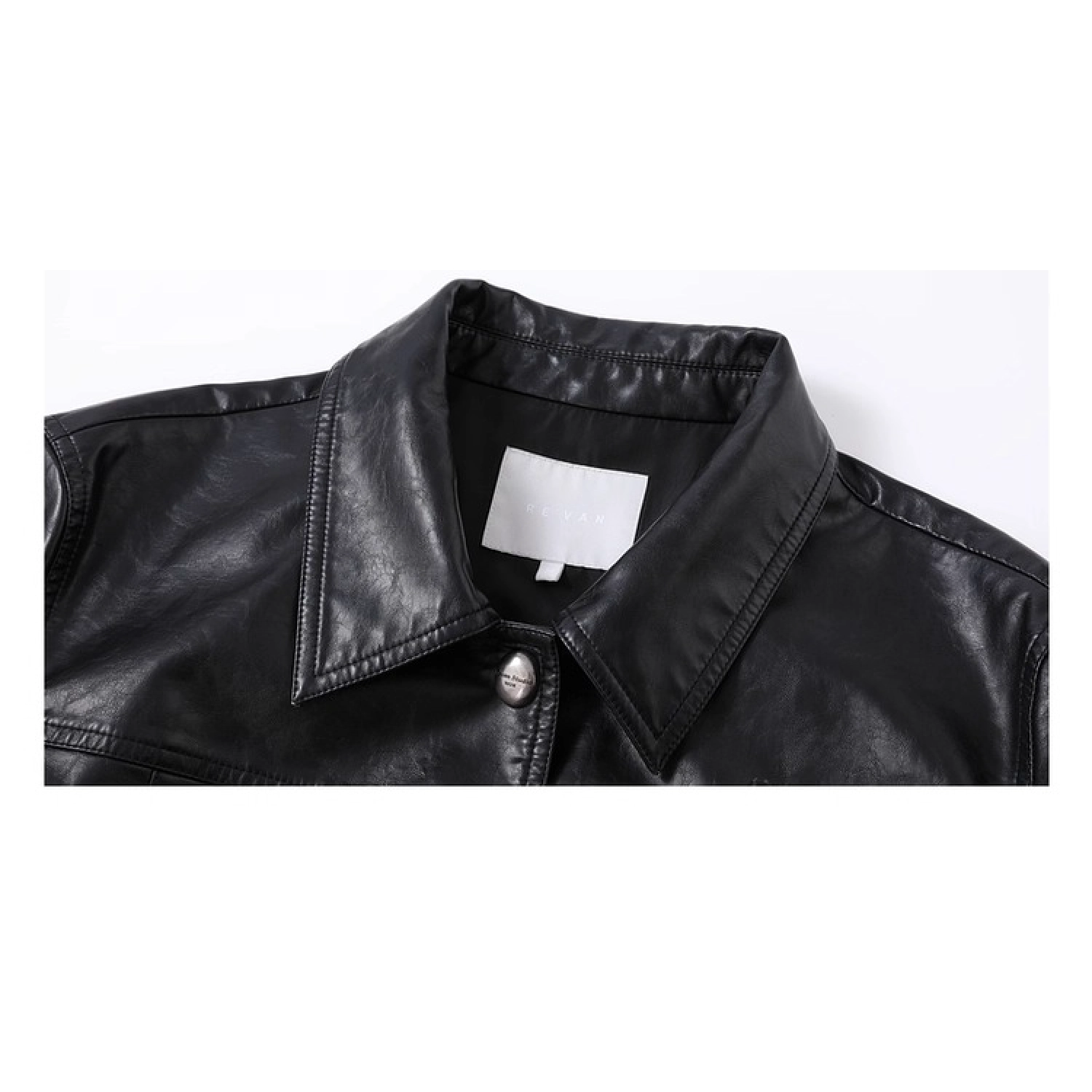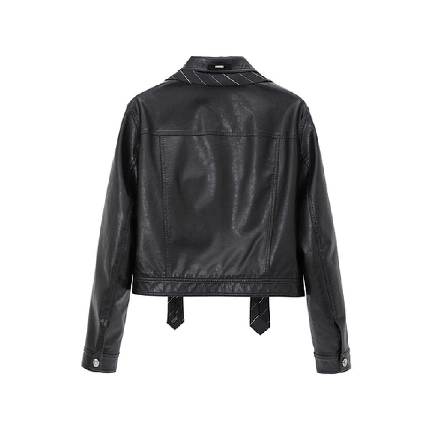 REVAN Classic PU Leather Jacket with Twill Tie Trim Black