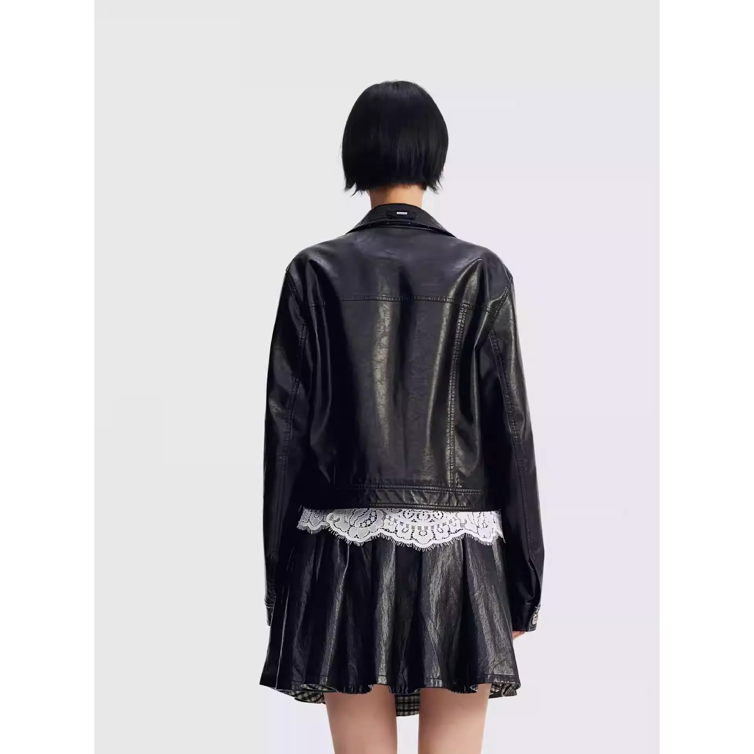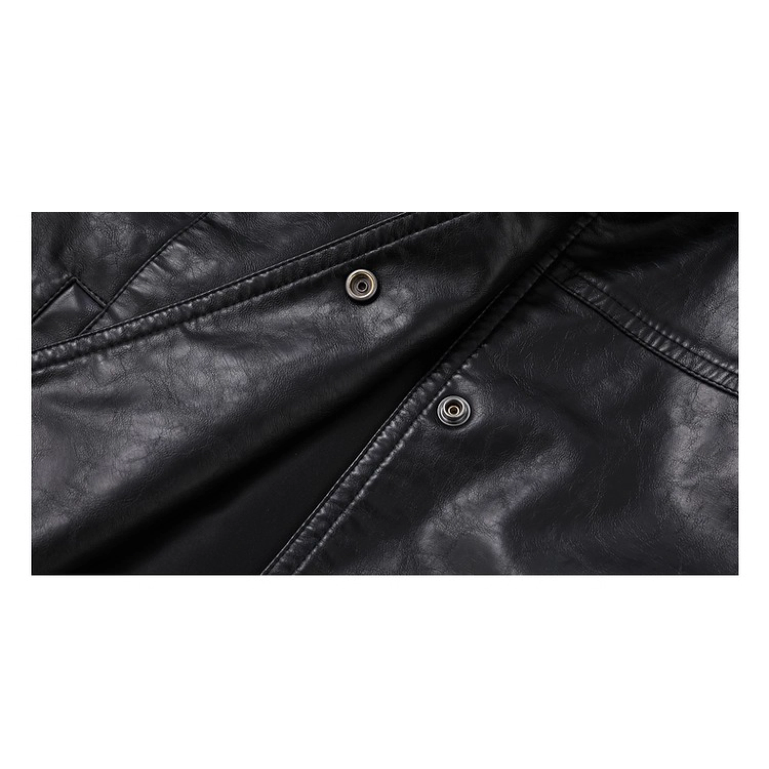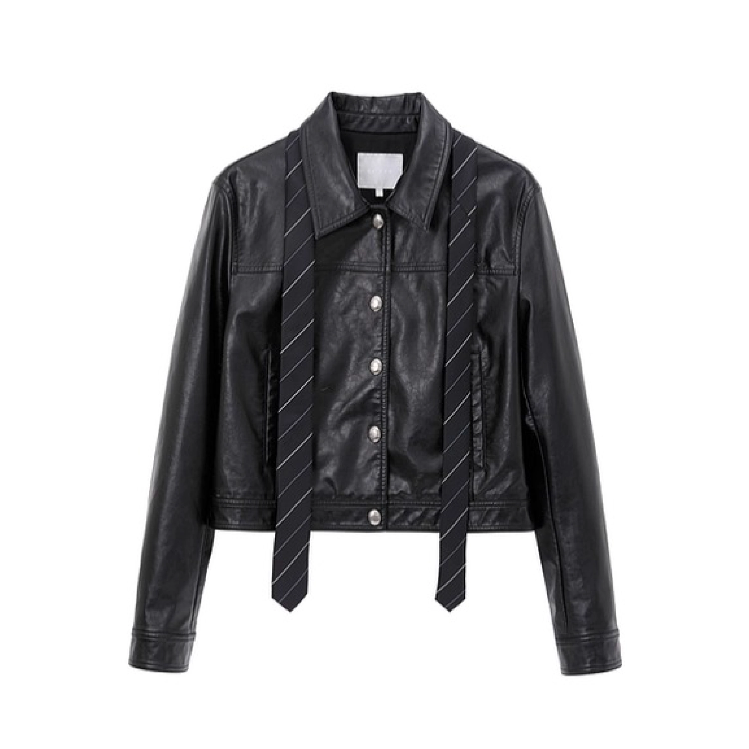 REVAN Classic PU Leather Jacket with Twill Tie Trim Black