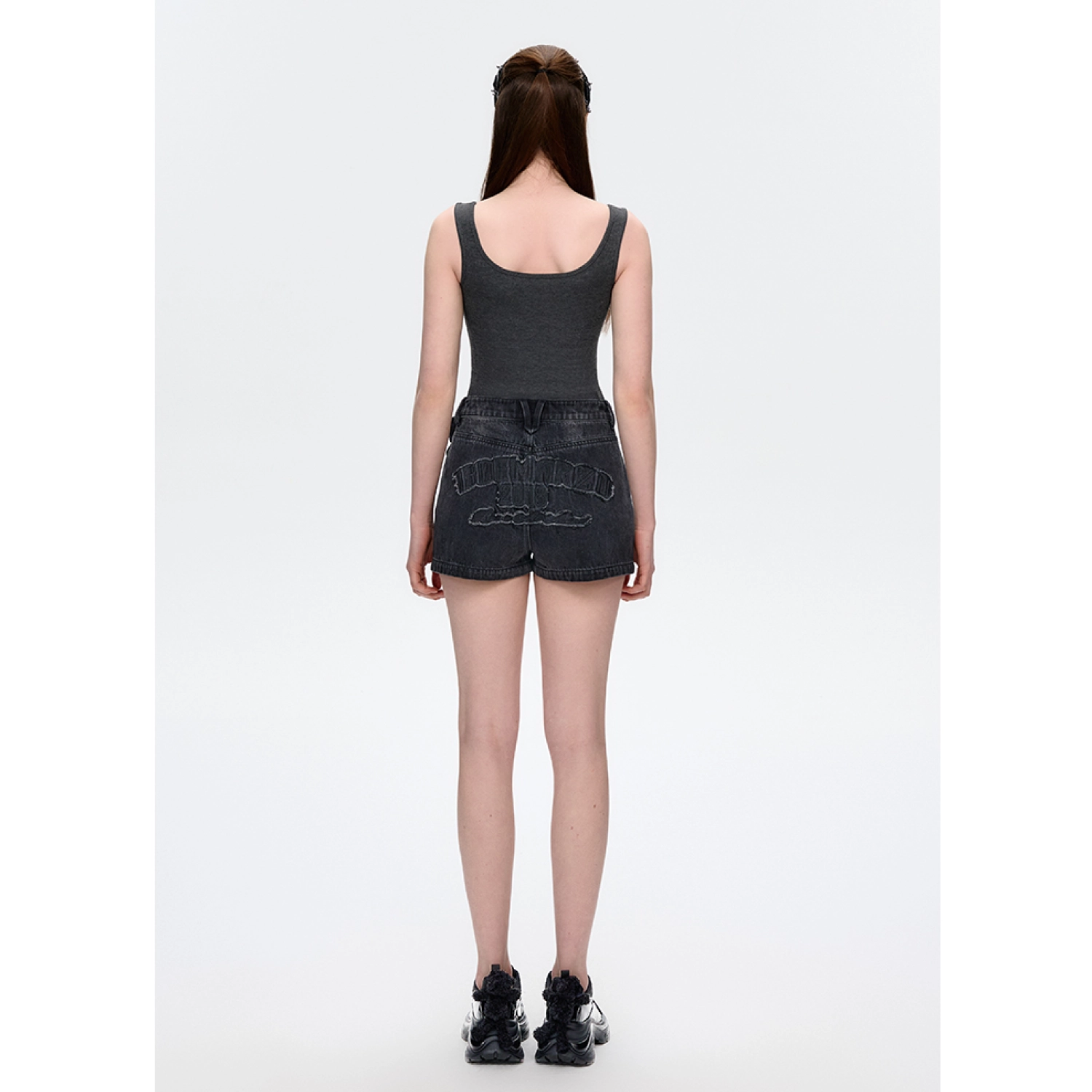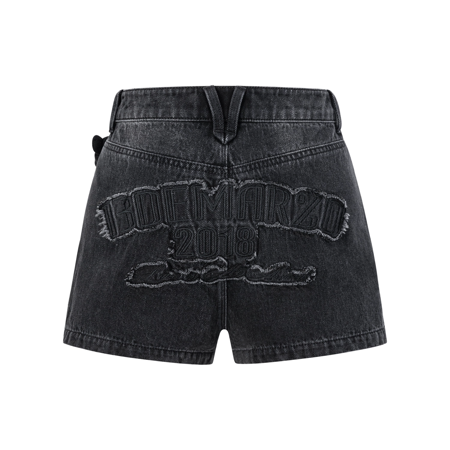 13DE MARZO Denim Frayed Embroidered Shorts Black