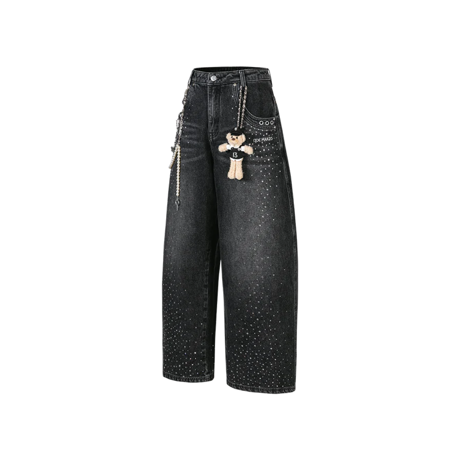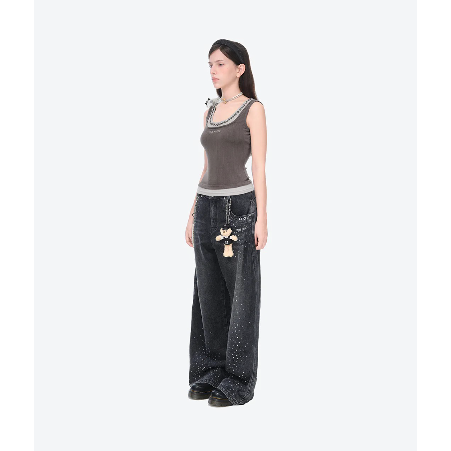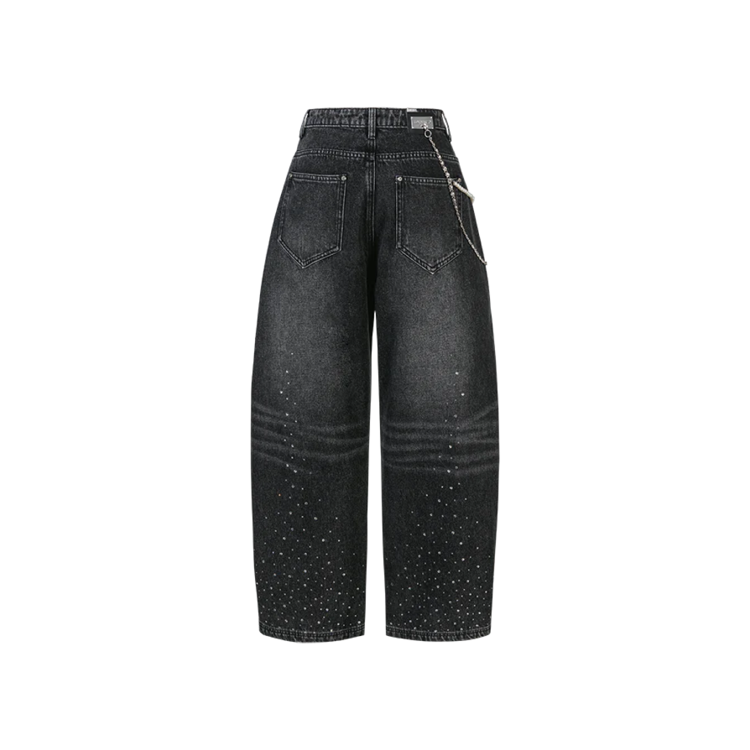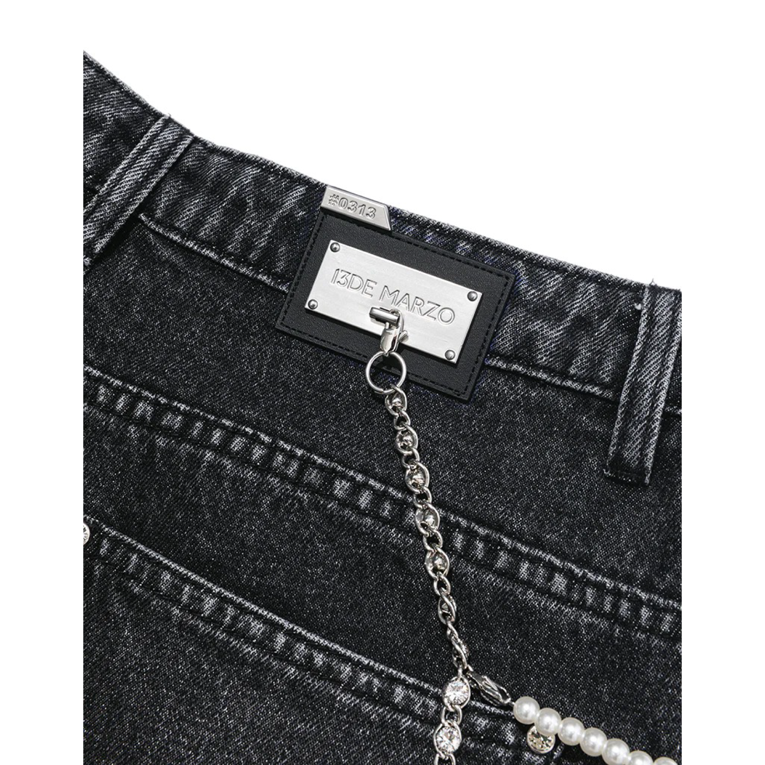 13DE MARZO Faux Rhinestones Pearl Chains Jeans Black