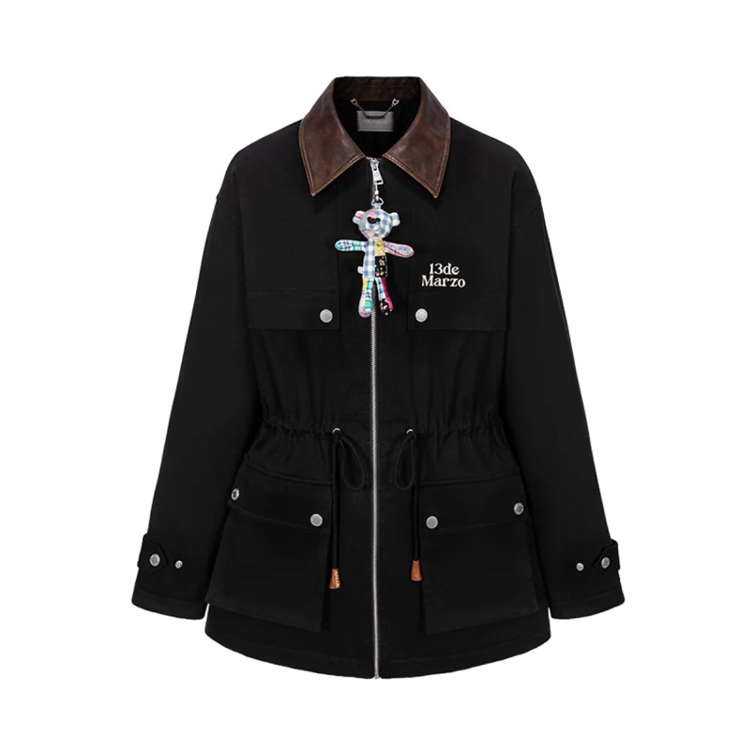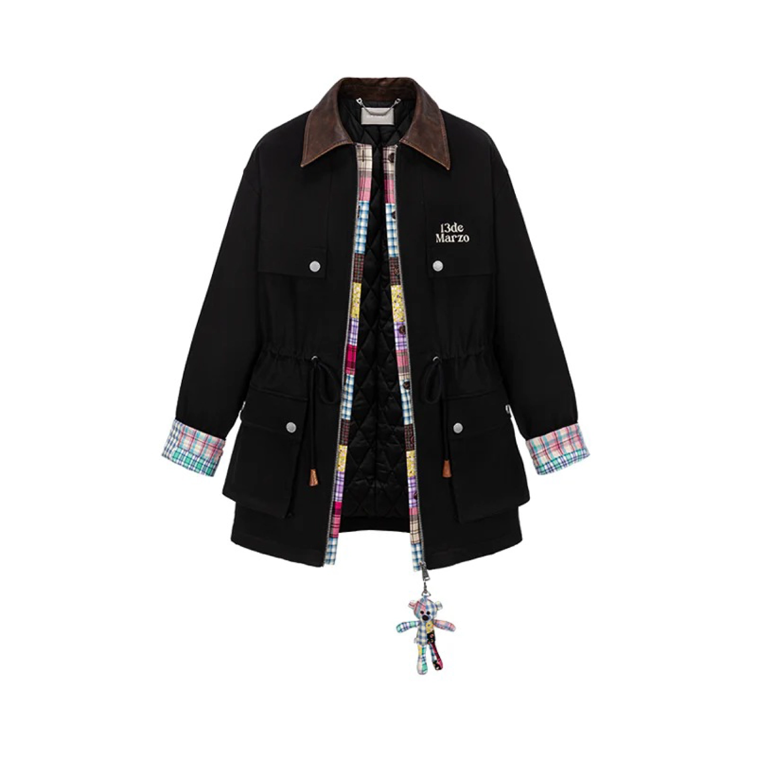 13DE MARZO Patchwork Bear Parka Coat Black