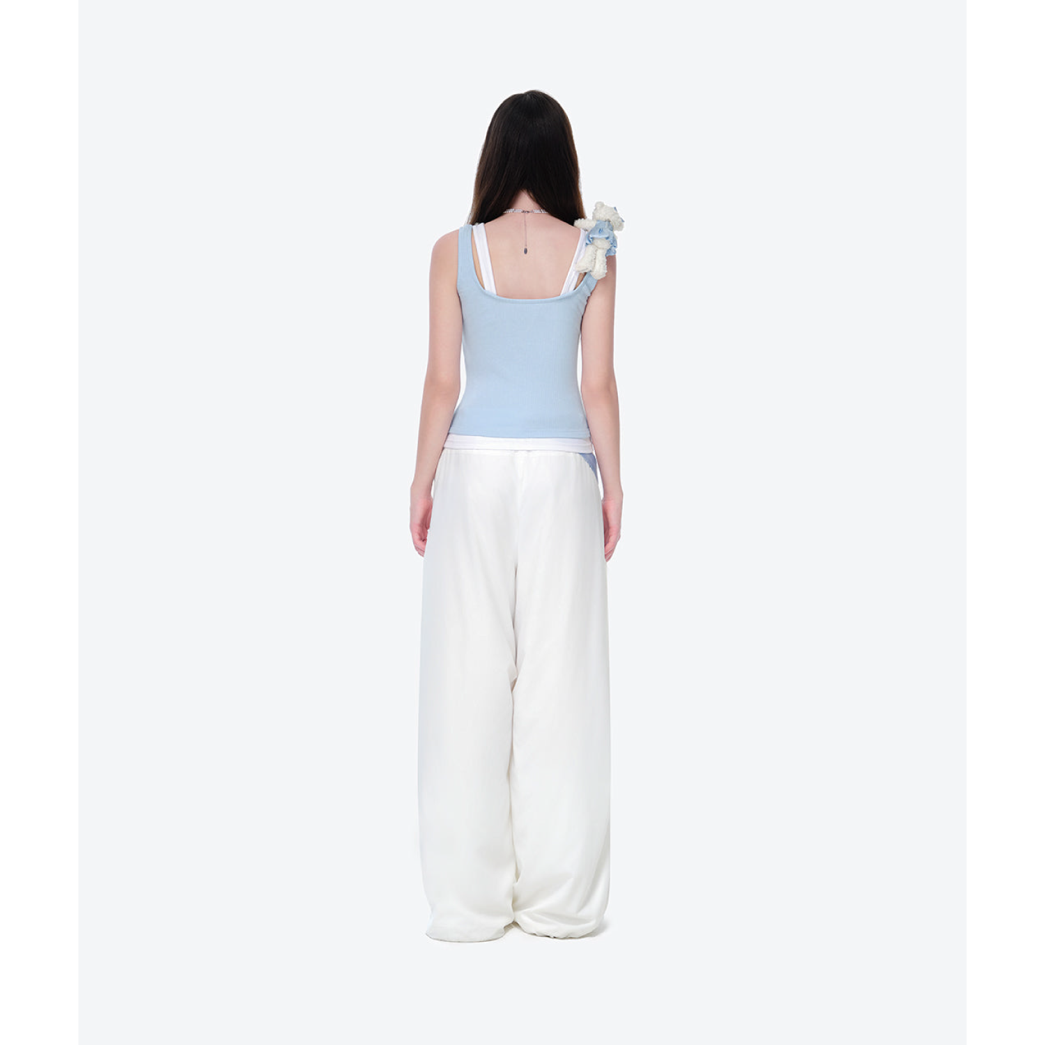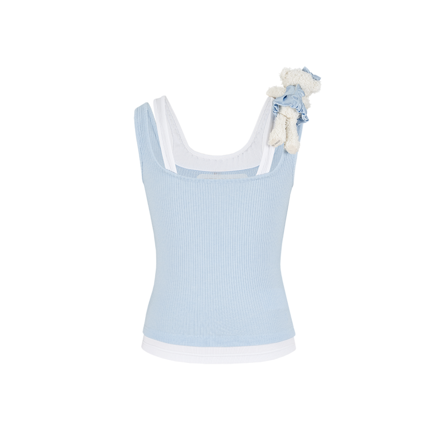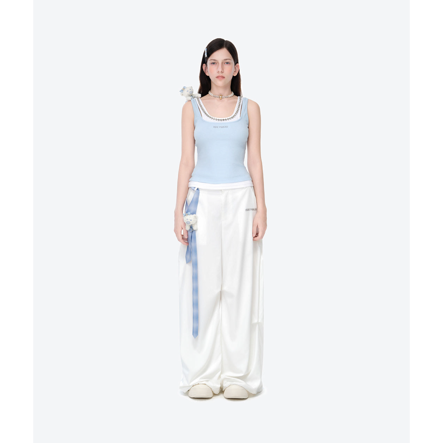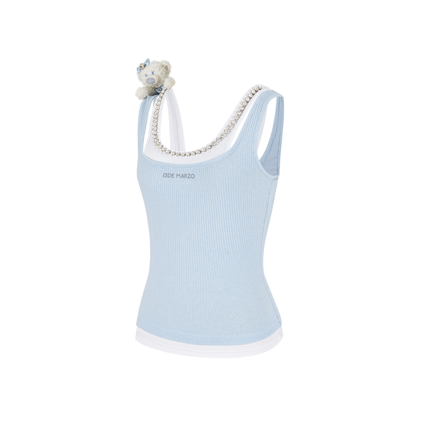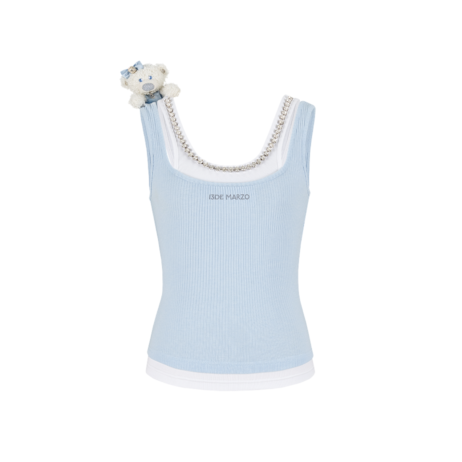 This mock-neck jewel collar tank features a clever faux layered collar design that naturally elongates the neckline and creates an effortlessly flattering shoulder-to-head ratio. Delicate hand-sewn crystals adorn the tonal collar with a subtle shimmer, lending an air of understated, debutante-like elegance. The ribbed fabric offers a soft, stretchy fit that contours the body without constraint. It masterfully blends a relaxed American chill aesthetic with refined sparkle—the lightweight, layered construction makes it an easy yet standout piece that seamlessly integrates into various styles and everyday wardrobes. A true gem that appears minimalist but is rich in thoughtful details.