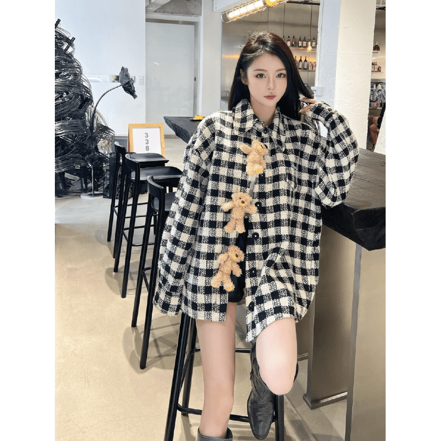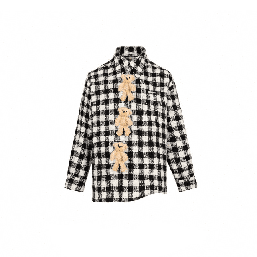 13De Marzo Plush Rabbit Button Plaid Shirt Black