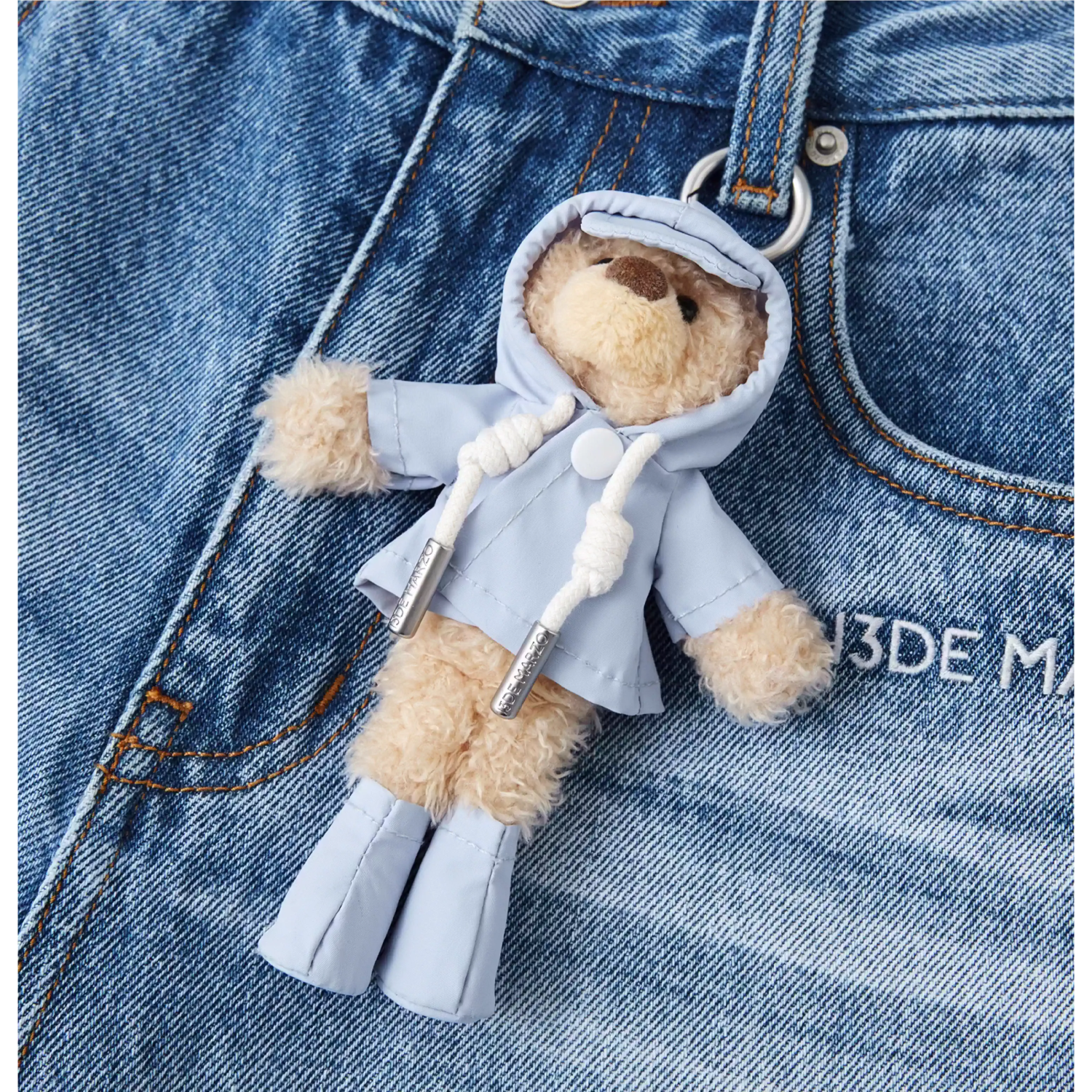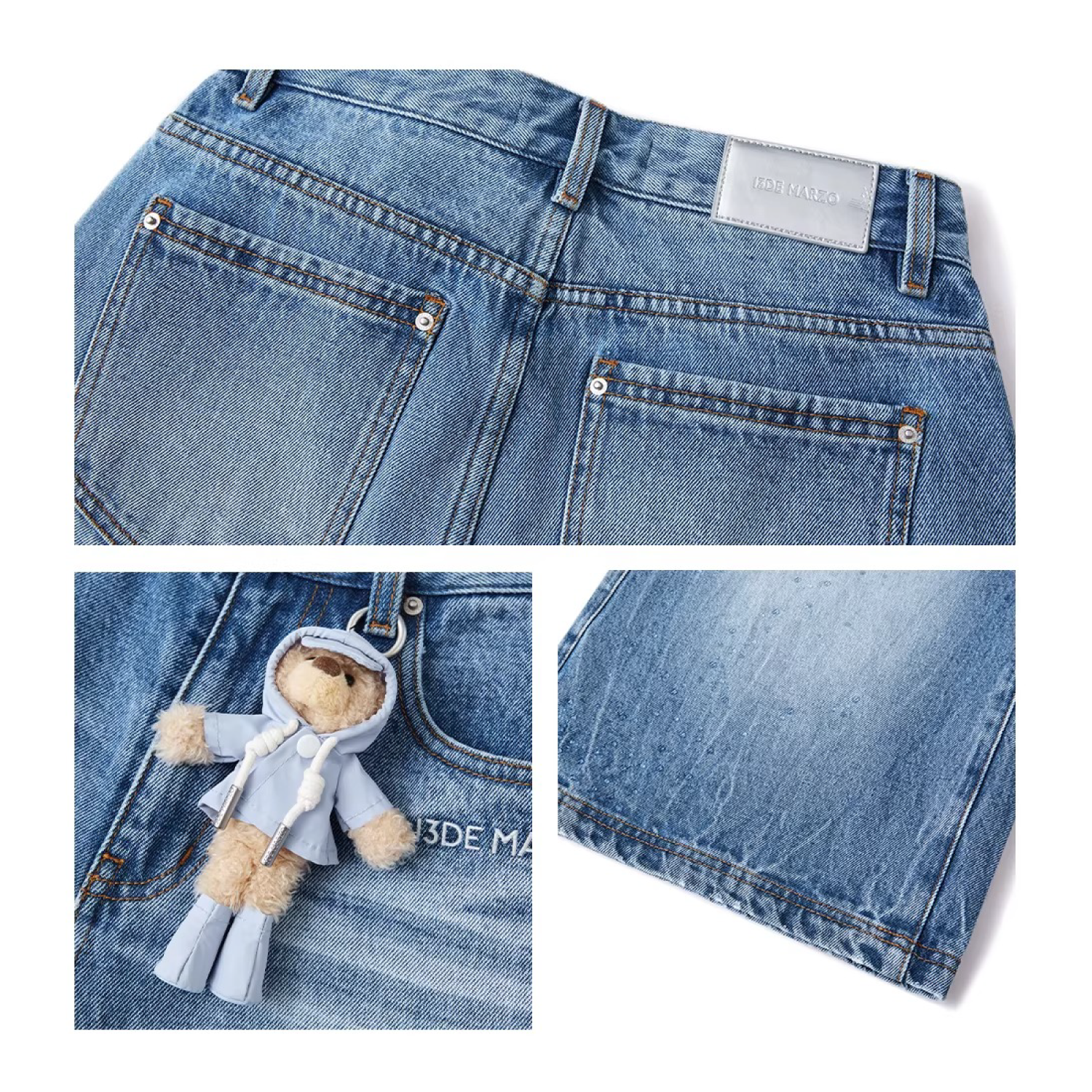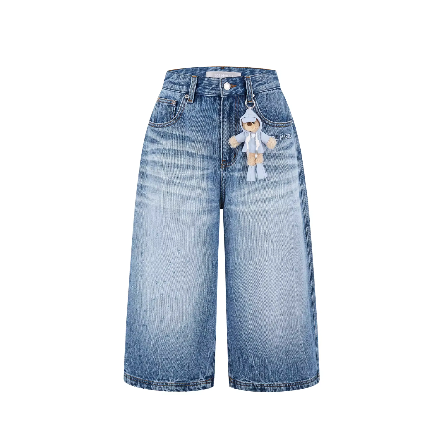 Inspired by a rainy day, these cropped jeans feature a unique denim washing technique that creates a cracked, rain-streaked effect—perfectly blending design and creativity for a vivid, atmospheric look. Clear heat-set crystals are scattered like falling raindrops, complemented by the brand’s classic bear motif dressed in a tiny raincoat, adding thoughtful detail throughout. The relaxed cropped fit offers both comfort and a stylish silhouette, making it easy to create an outfit full of rainy-day mood.