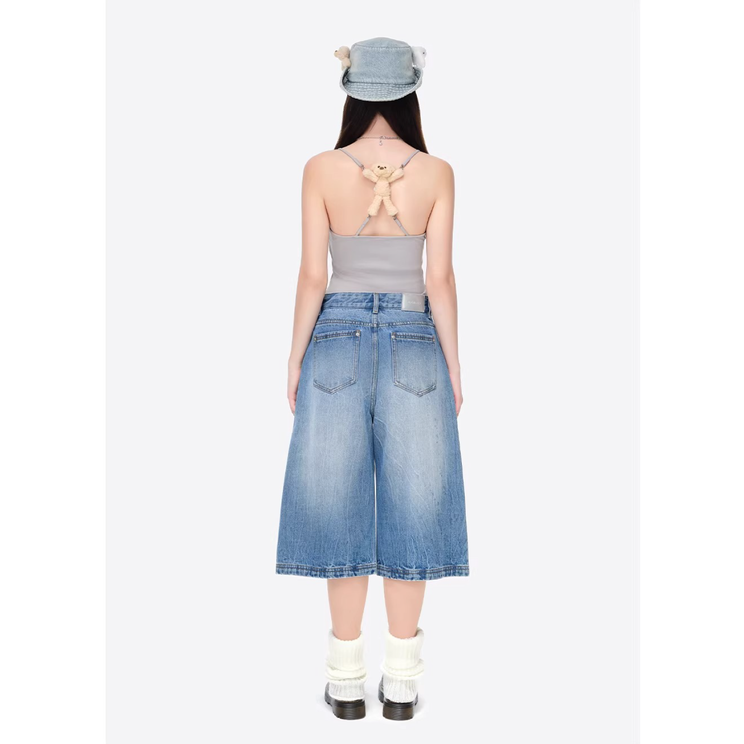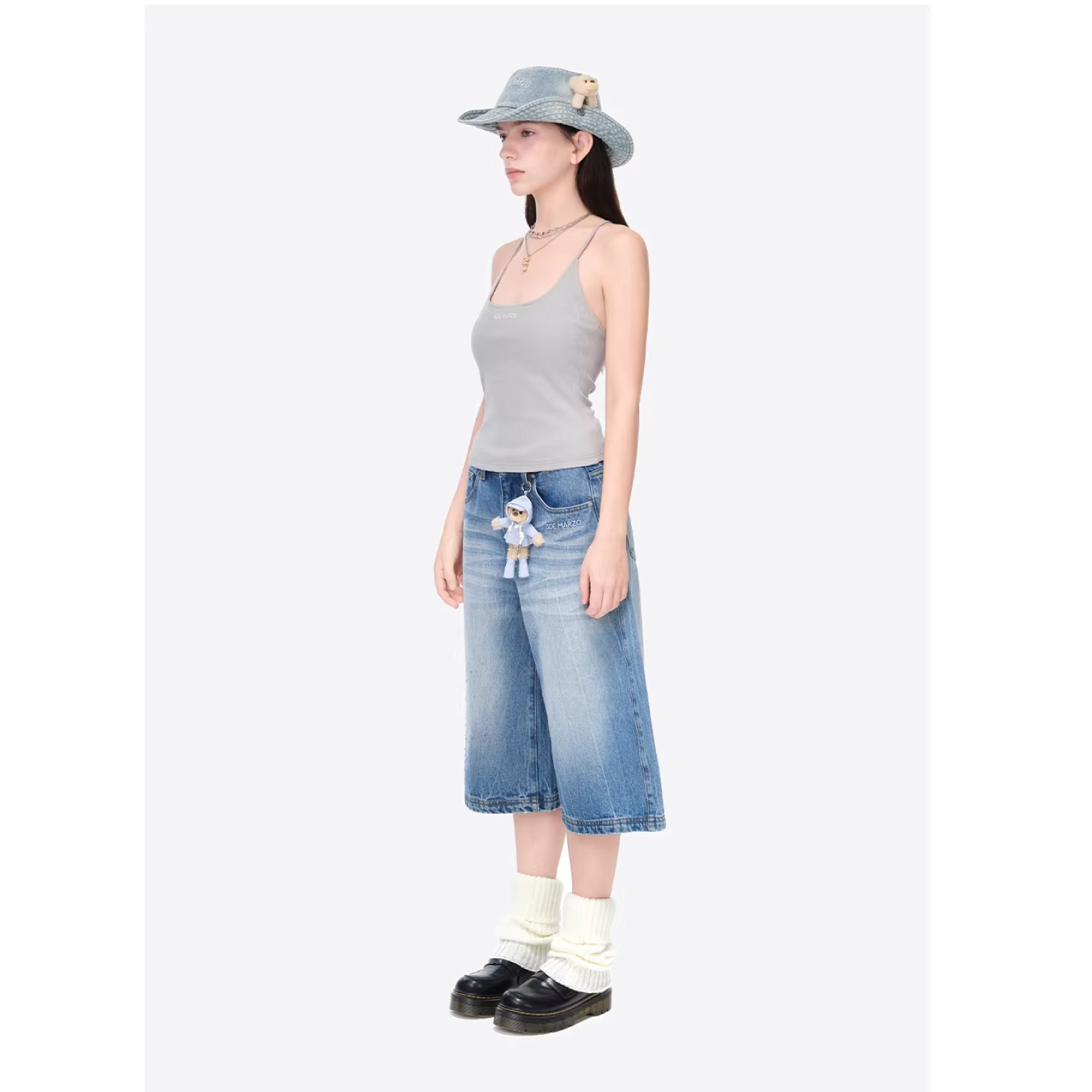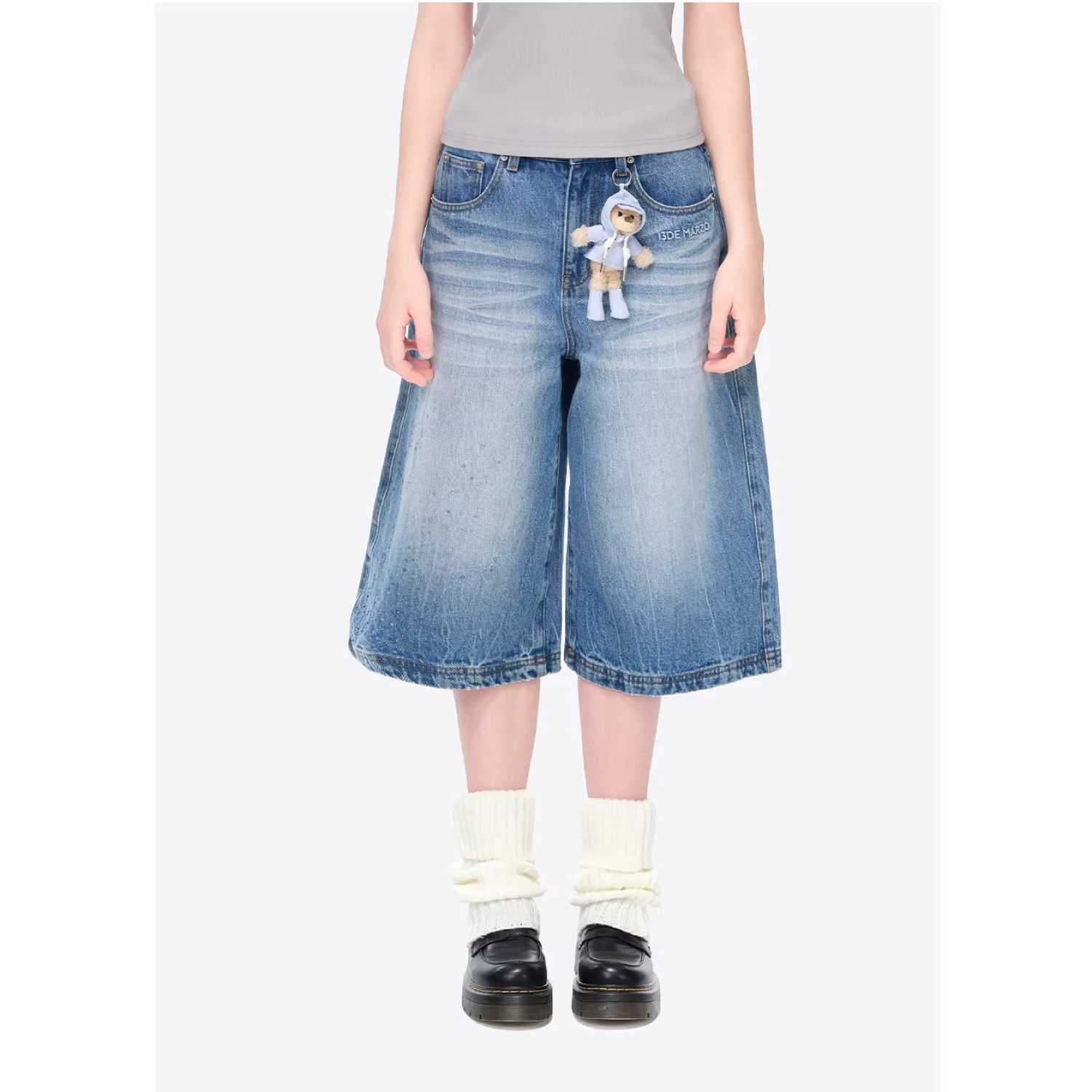 Inspired by a rainy day, these cropped jeans feature a unique denim washing technique that creates a cracked, rain-streaked effect—perfectly blending design and creativity for a vivid, atmospheric look. Clear heat-set crystals are scattered like falling raindrops, complemented by the brand’s classic bear motif dressed in a tiny raincoat, adding thoughtful detail throughout. The relaxed cropped fit offers both comfort and a stylish silhouette, making it easy to create an outfit full of rainy-day mood.