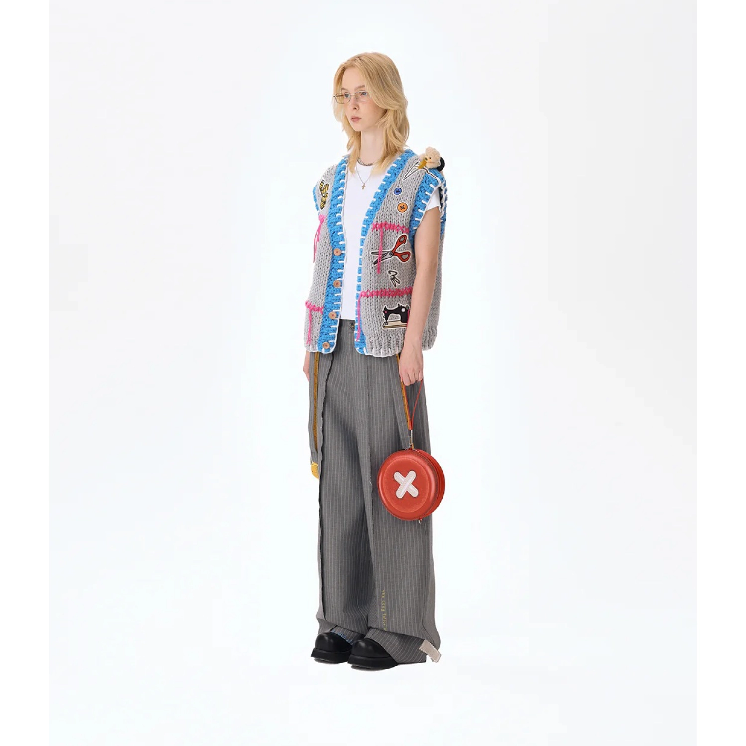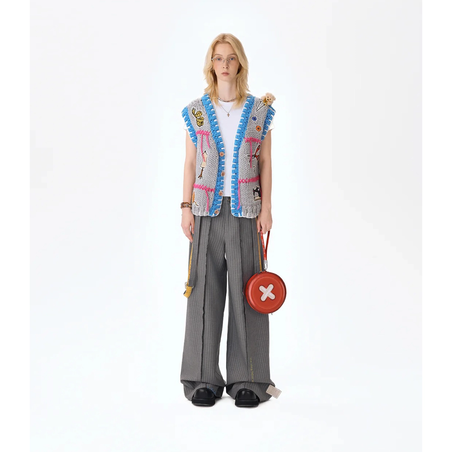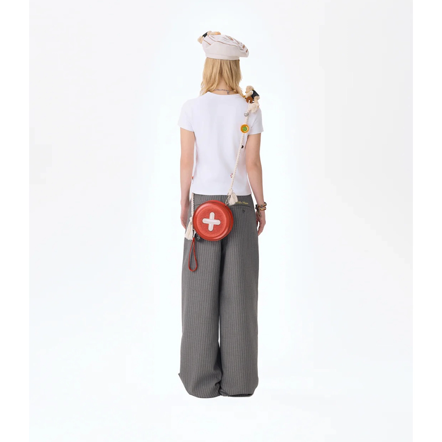 This statement button bag features an oversized bright yellow button-shaped body, delivering a fresh and distinctive silhouette that stands out from conventional designs. Its high recognizability makes it an instant eye-catcher. The rope strap is decorated with colorful buttons, a teddy bear charm, and other tailoring-inspired elements, adding layers of creativity and playfulness while expressing a unique, fashion-forward personality.
