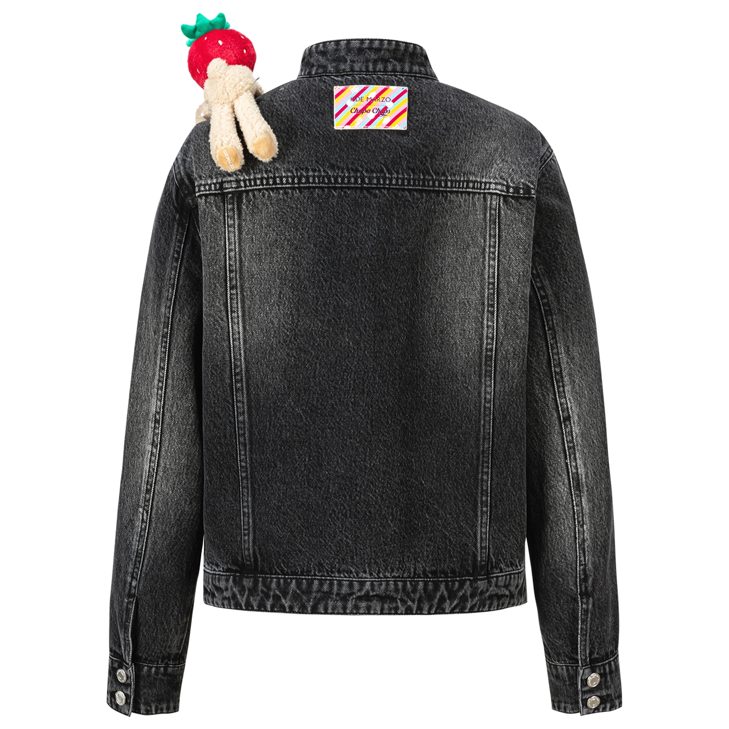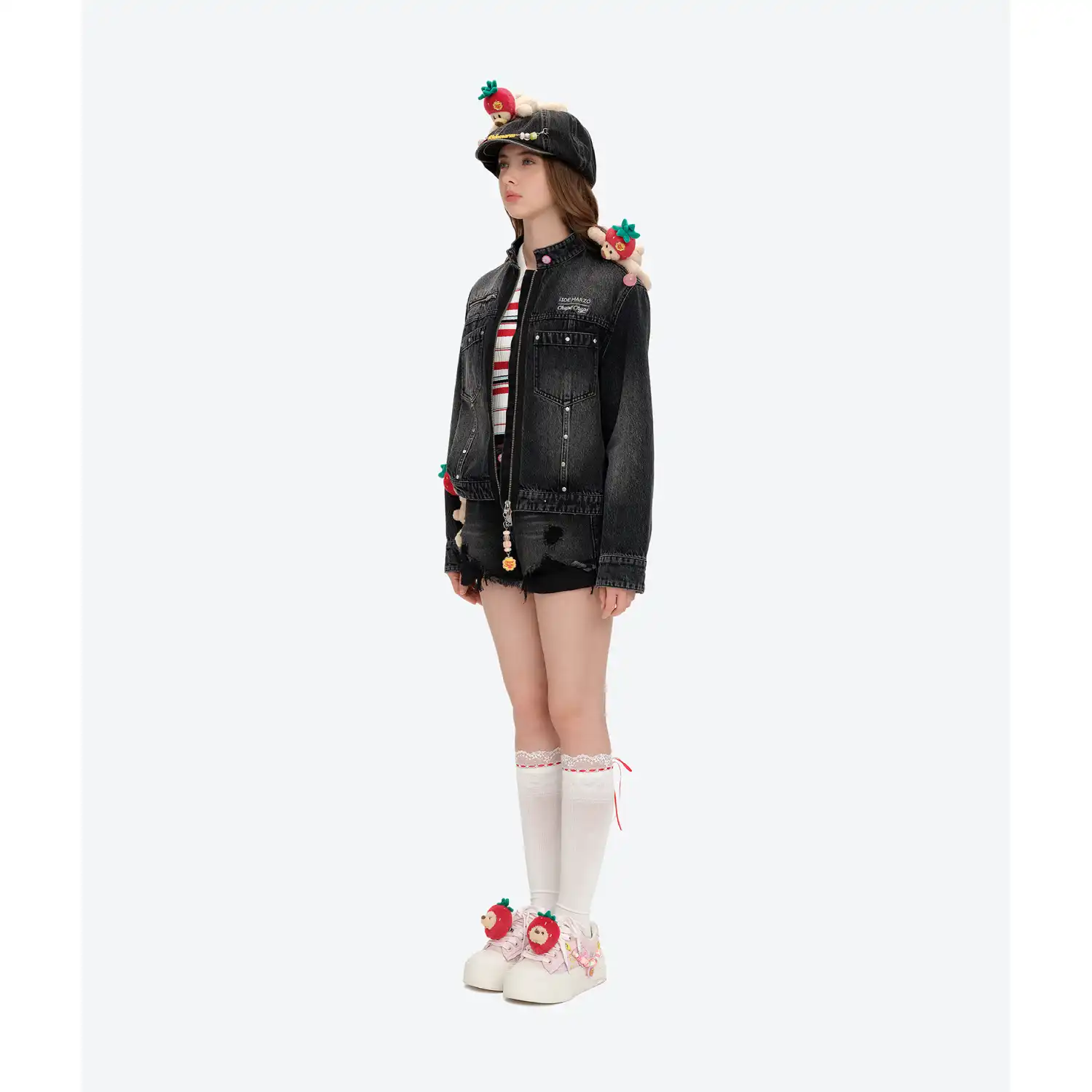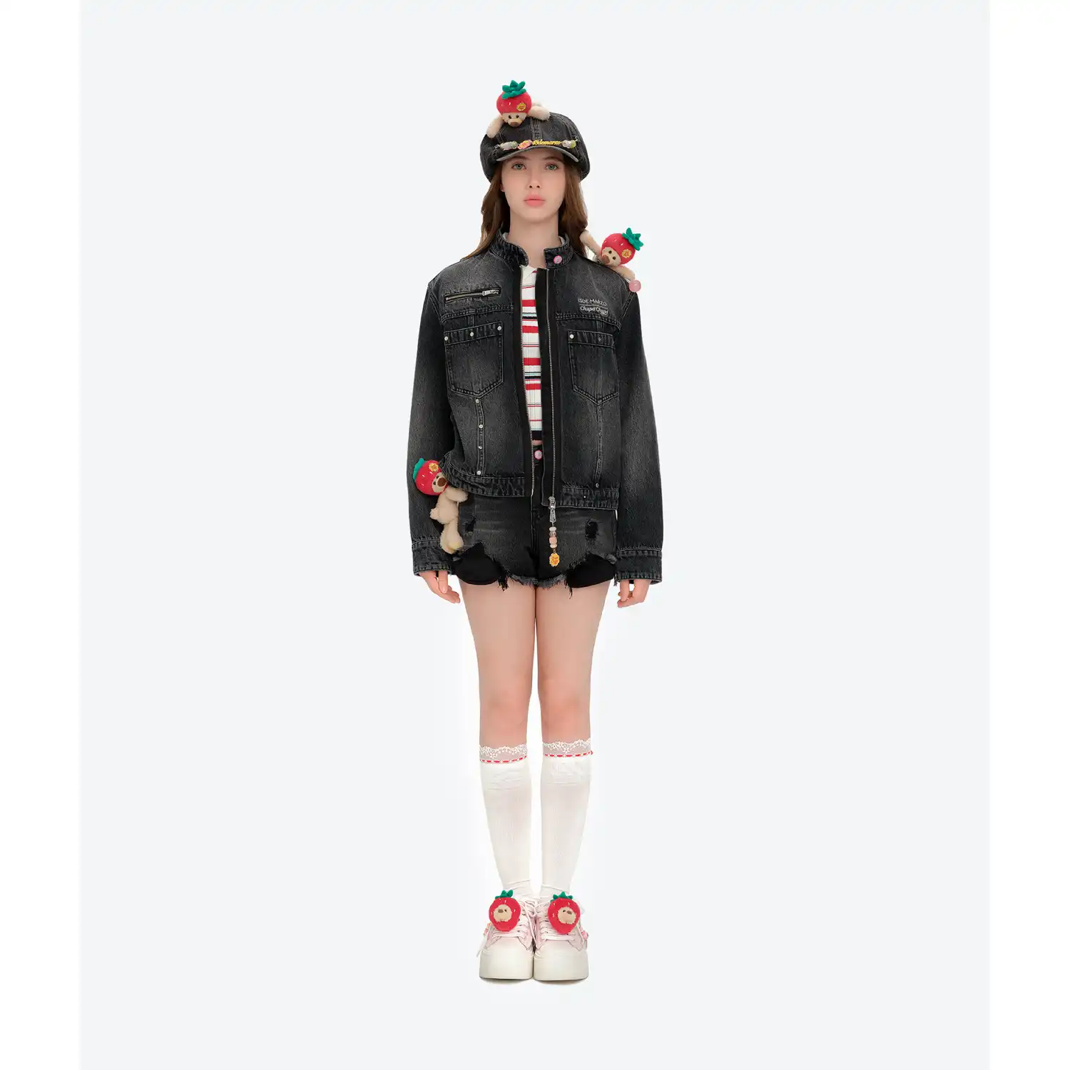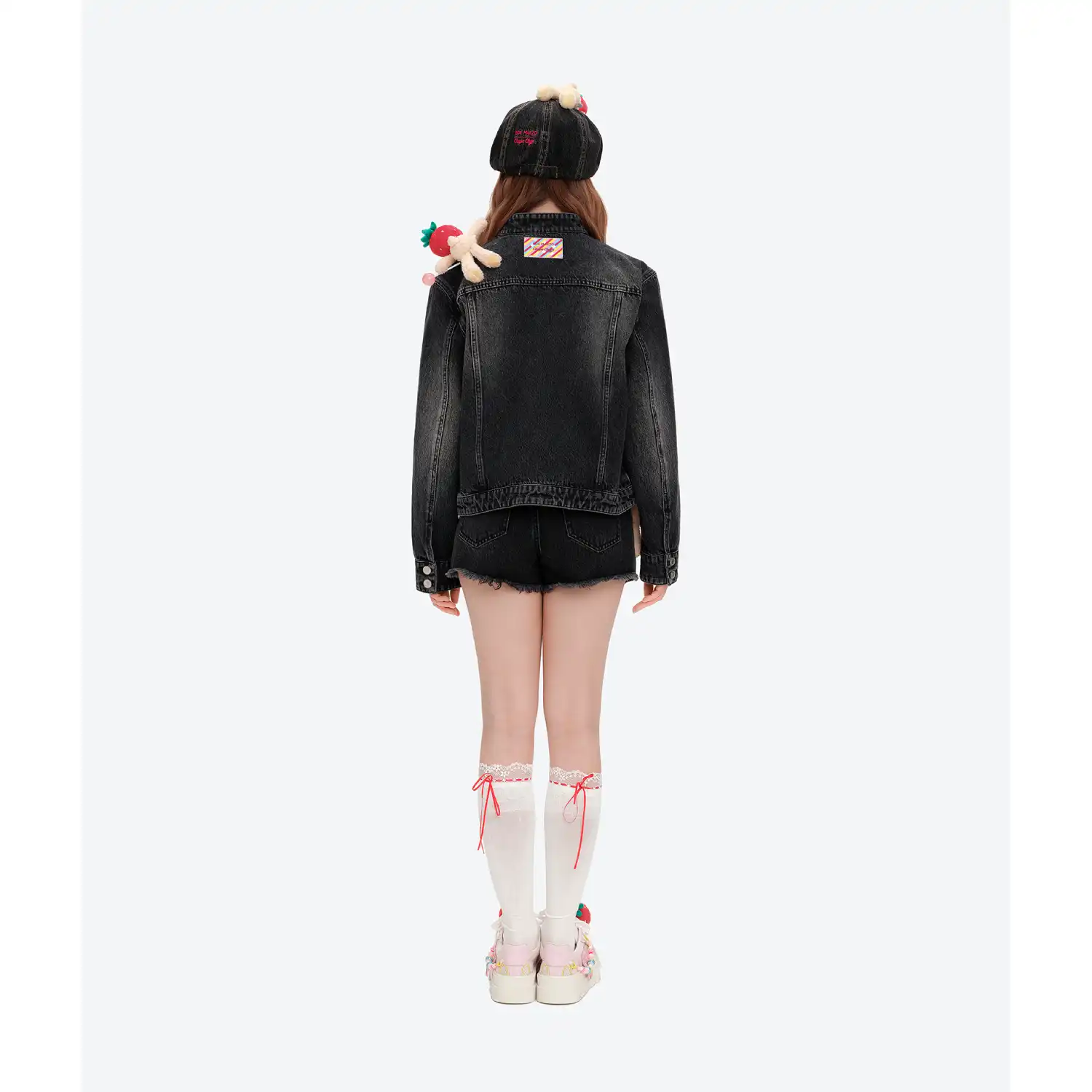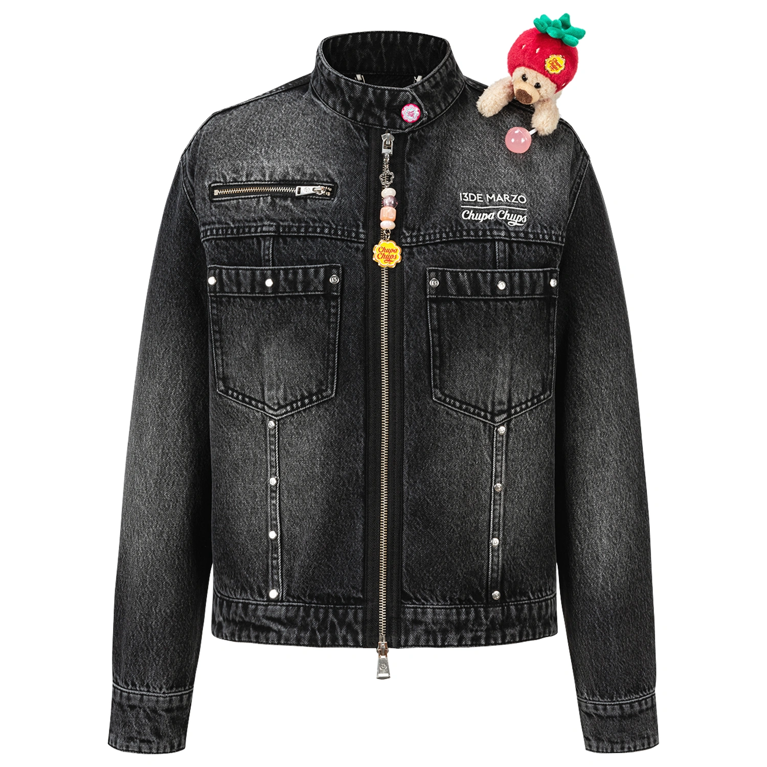 This Chupa Chups collaborative zip-up denim jacket is an early-fall essential that sews childhood sweetness straight into your streetwear. The zipper is adorned with Chupa Chups lollipop bead charms—zipping it up feels like wearing a string of sugary memories. A miniature Chupa Chups bear charm sits at the shoulder, instantly boosting the exclusive collaboration identity. The sweet-meets-edgy detail hits right at the heart of girlish charm.
