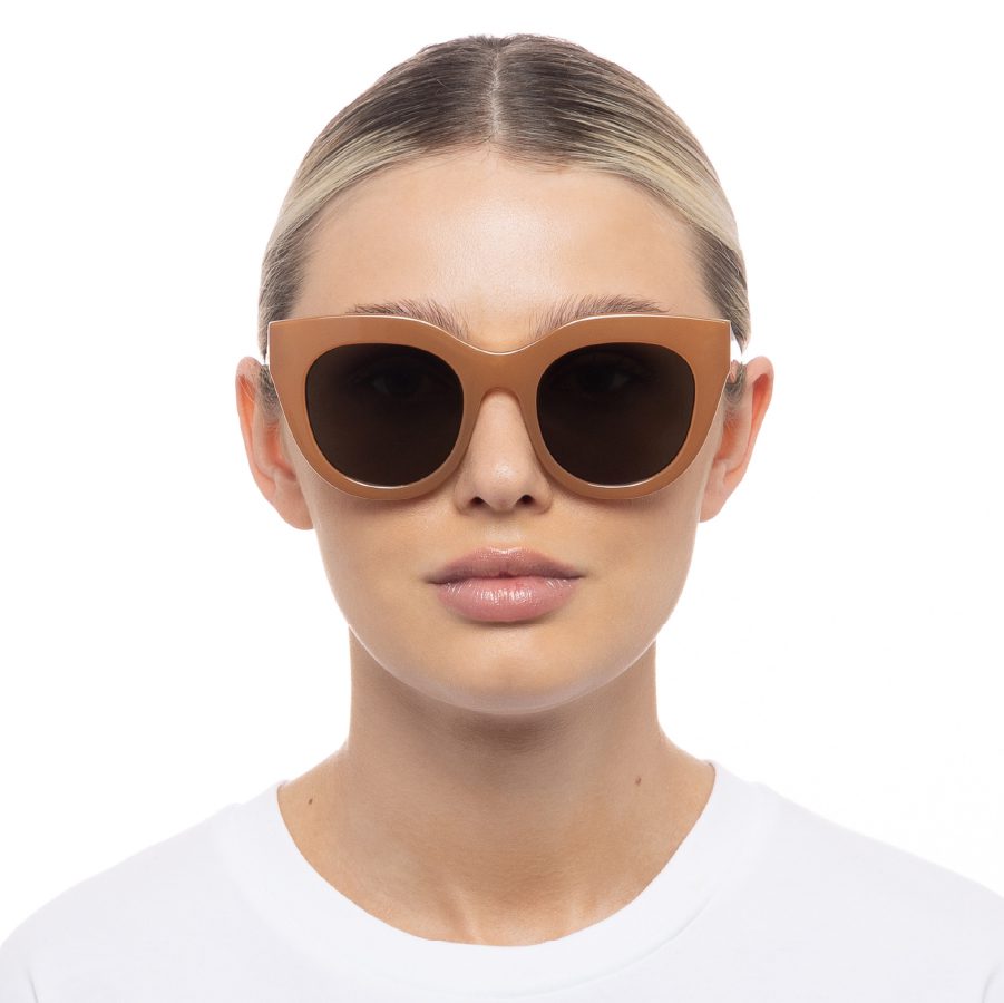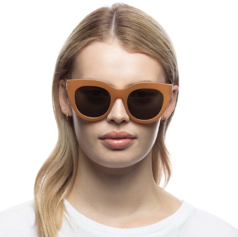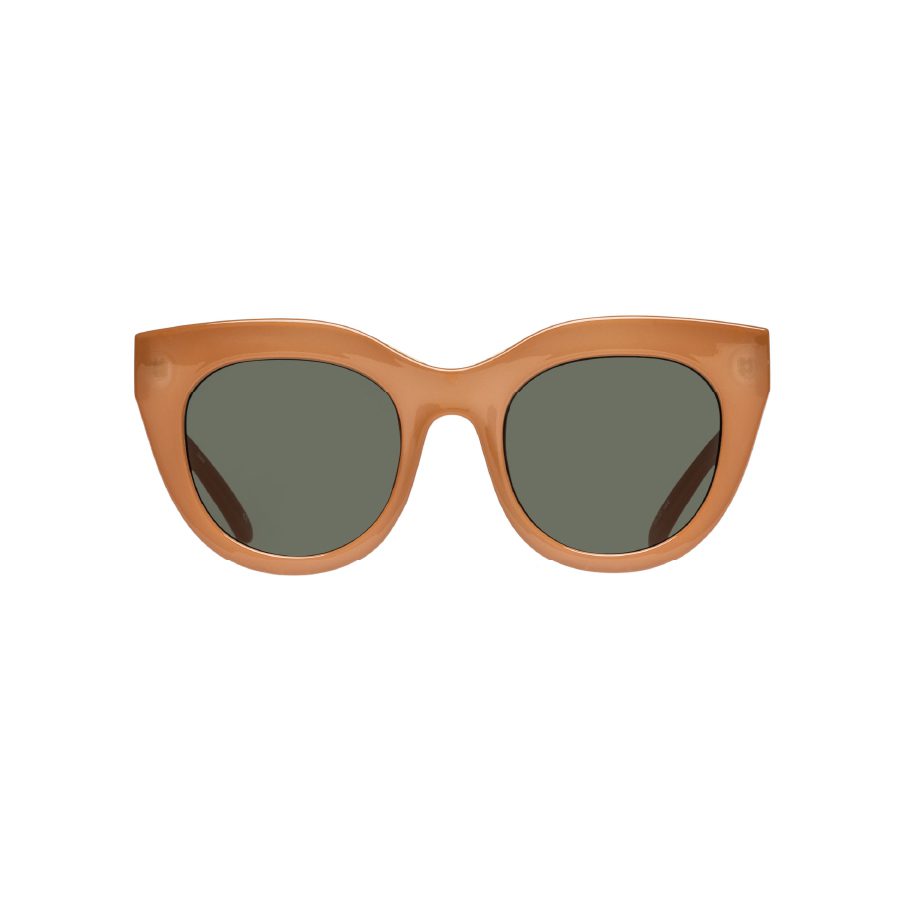 A favourite of Meghan Markle and Olivia Palermo, the Air Heart silhouette is an iconic Le Specs style. With oversized and dramatic proportions reminiscent of a cat eye, the style is designed with a thick caramel frame and luxurious metal top bar inlay, then fitted with premium zero base khaki grad flat lenses.