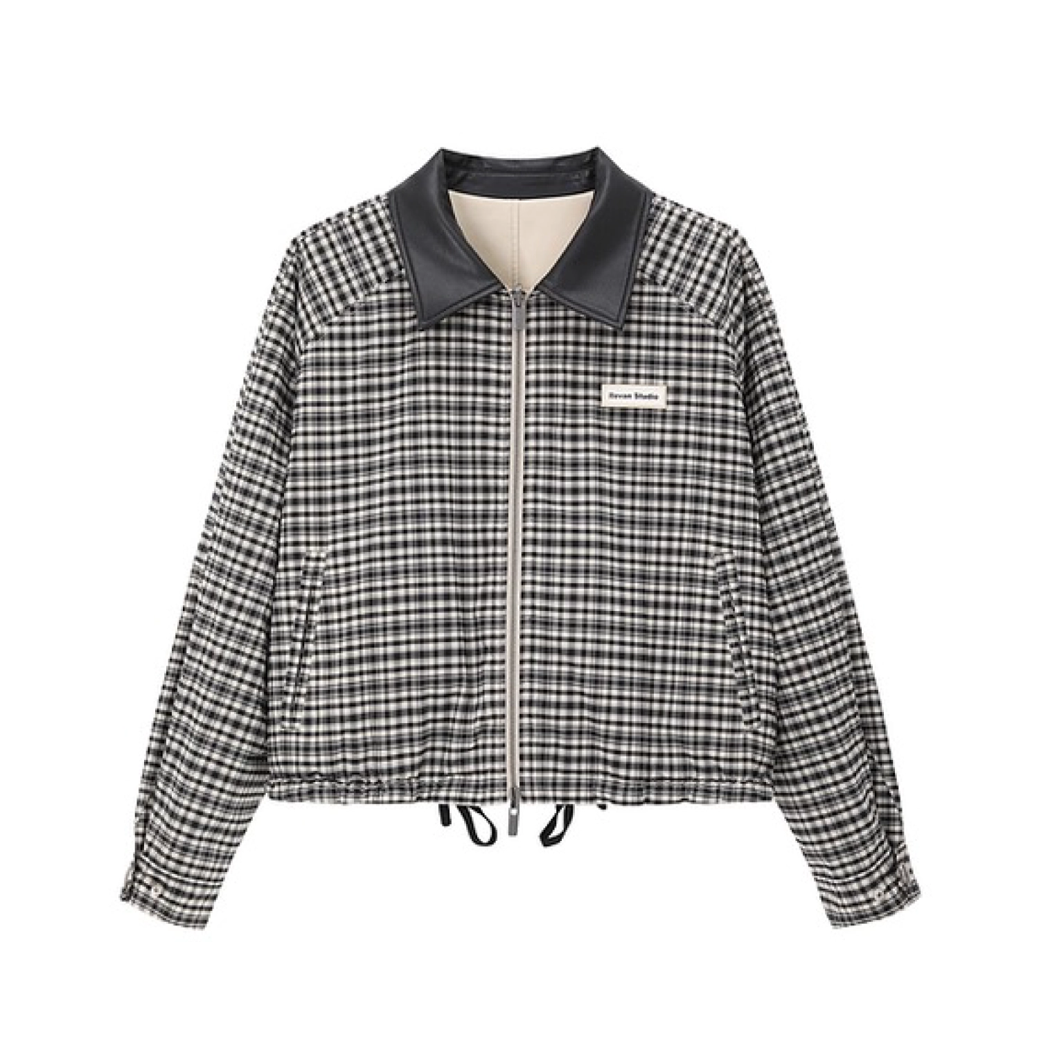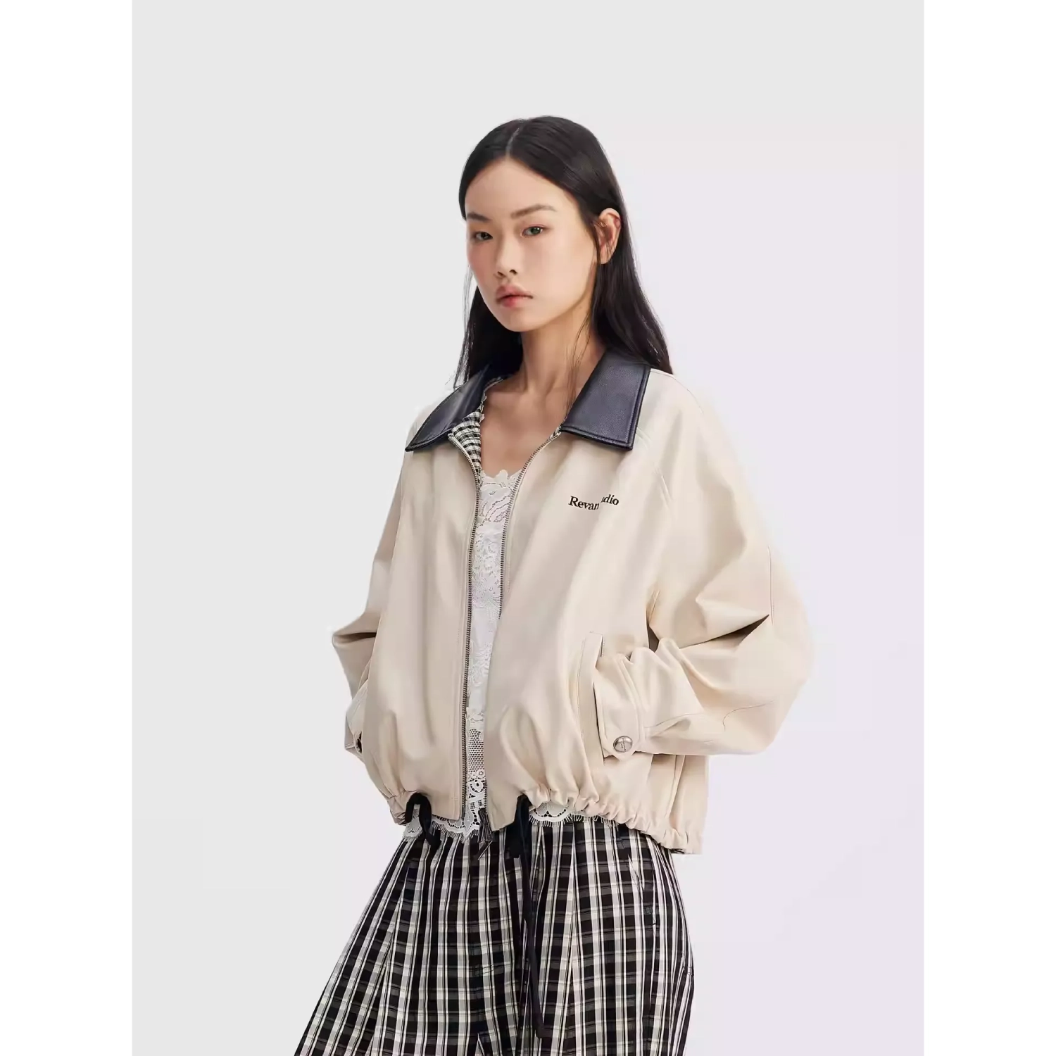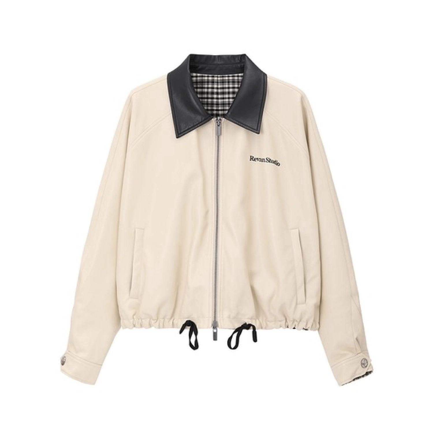 REVAN Reversible Balloon PU Leather Jacket with Check Pattern Khaki