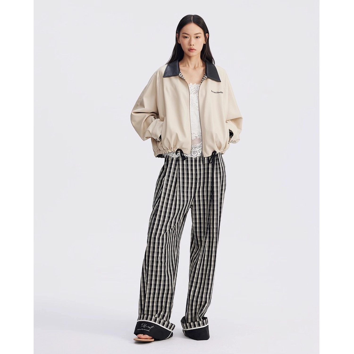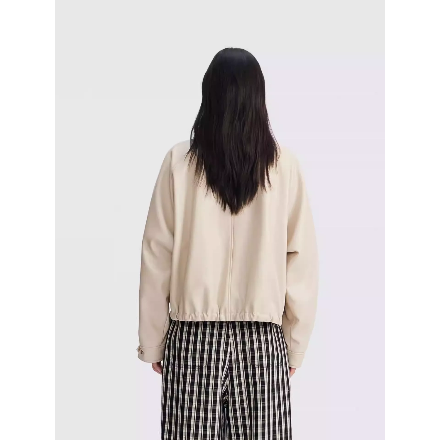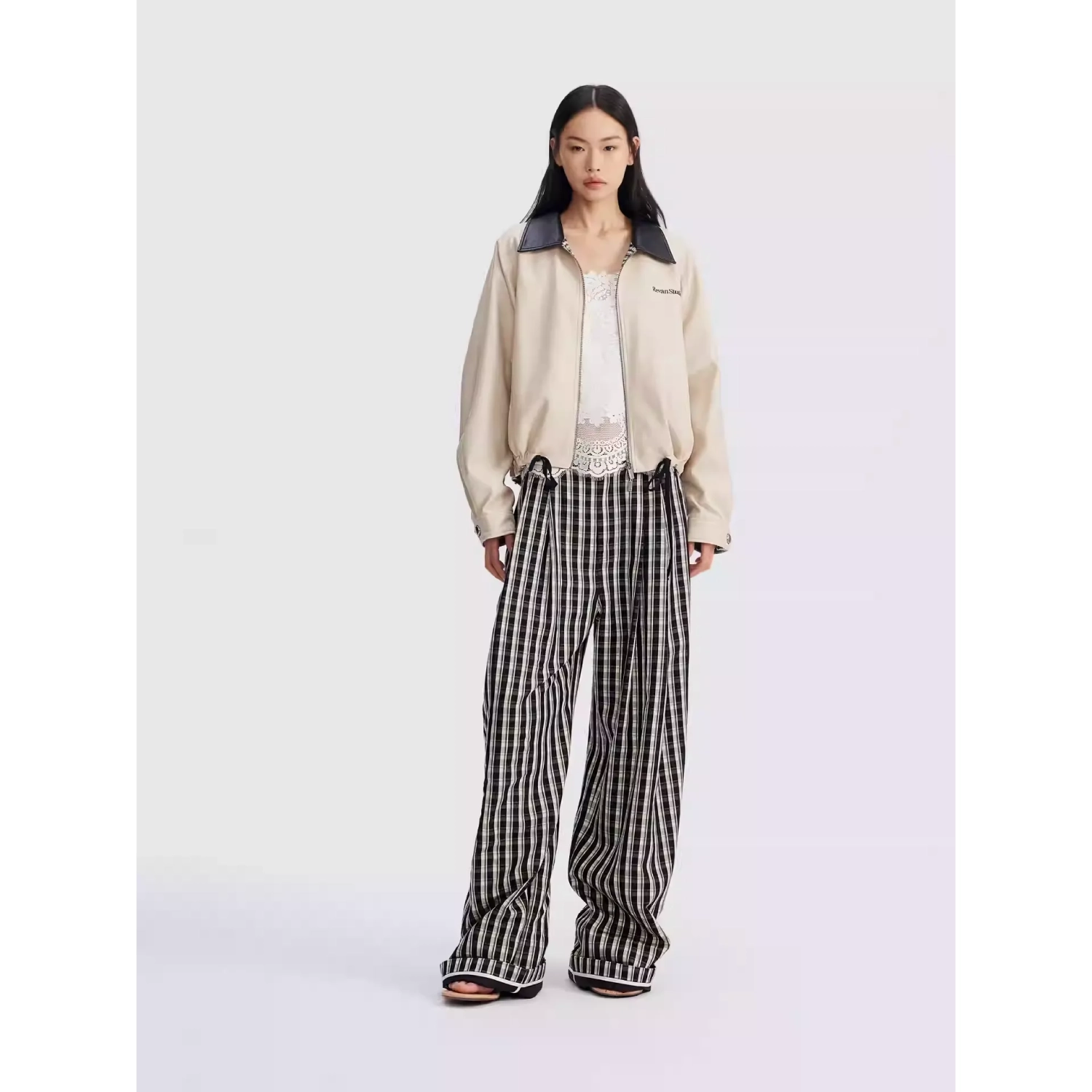 REVAN Reversible Balloon PU Leather Jacket with Check Pattern Khaki